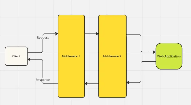 Middleware มองง่ายๆ มันคือ script/program ของเราตัวนึง ที่แทรกอยู่ตรงกลางเวลามีการเรียก Request มาที่แอพพลิเคชั่นเรา ถ้ามองเป็นรูปจะประมาณนี้